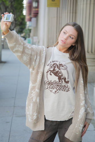 Oversized Mixed Media Western Graphic Knit Top: TAUPE