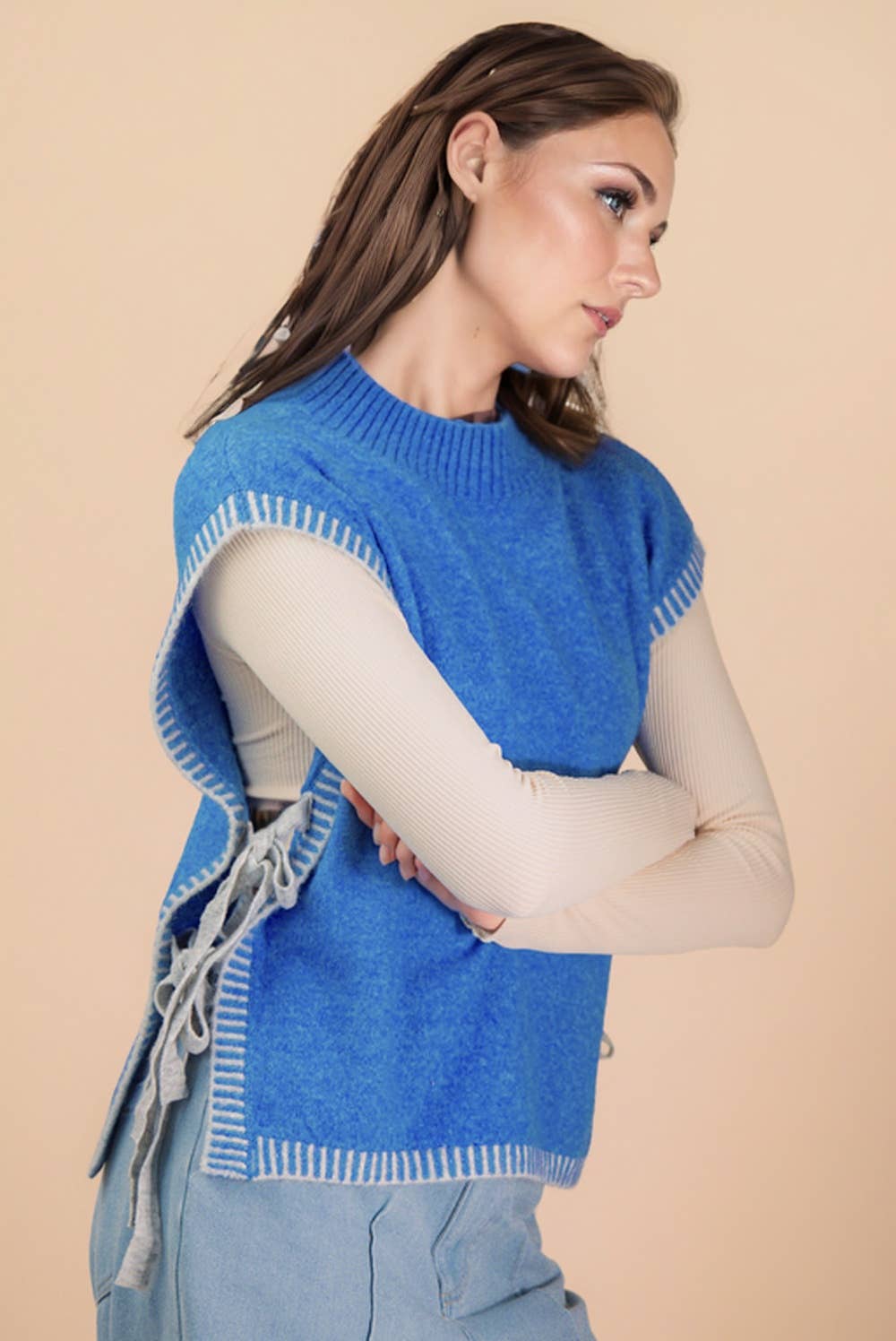 - Side Tie Detail Knit Sweater Vest Top - Mock Neck - Contrast Detail (Model height: 5"9", wearing a Small)
