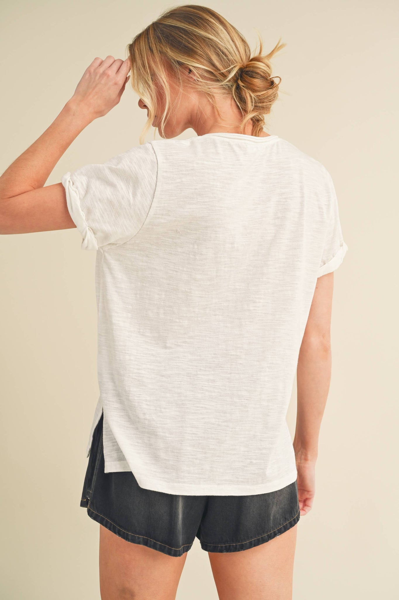 Upgrade your style with the Zoie Top features a short rolled sleeves for a lived-in look and raw seam detailing at the v-neckline for an edgy touch.