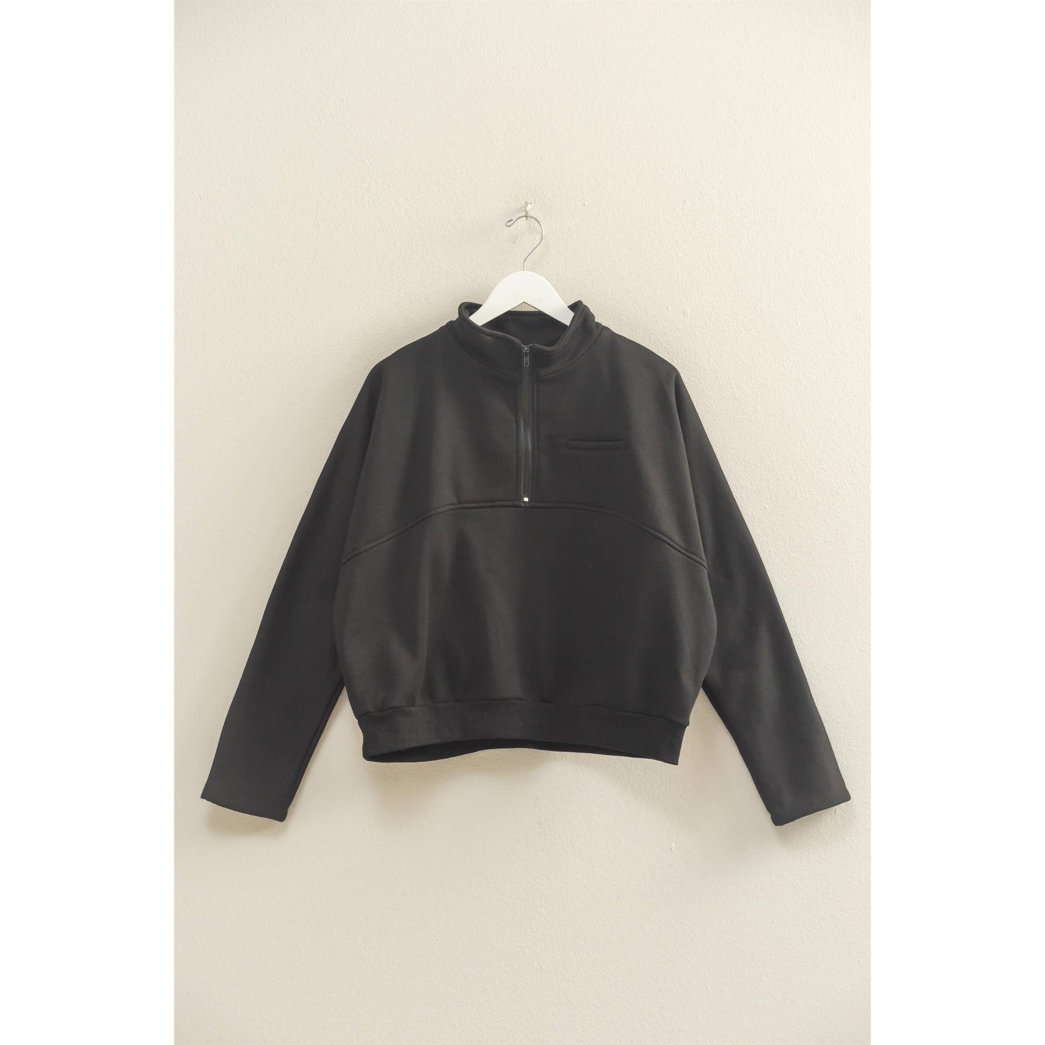 his top features a comfortable, relatable silhouette with a half-zip neckline and a discreet chest pocket for practical charm. The fit allows for easy layering, making it ideal for transitional weather. Style it with denim or layer under a jacket for a cozy yet refined look. Perfect for relaxed weekend outings or casual workdays. Model Is 5' 8" Tall, 32" Chest, 25" Waist, 34" Hips And Wearing A Size Small Imported. Designed In The USA
