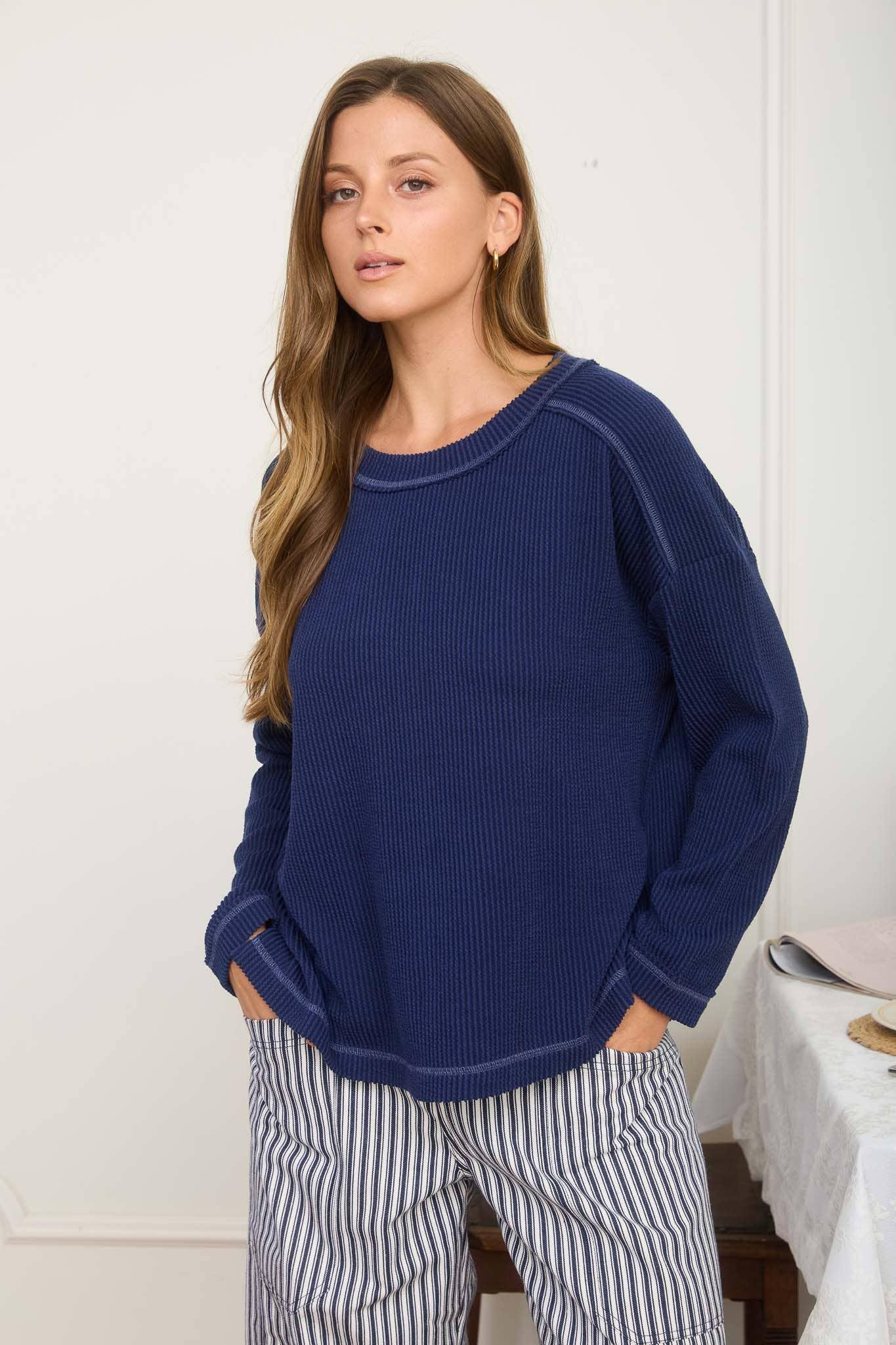 ROUND NECK CREW NECKLINE EXTENDED SHOULDER DETAIL LONG SLEEVES EXPOSED SEAM RAW EDGE DETAIL RIBBED PATTERN NOT LINED KNIT TOP 63%POLYESTER 33%RAYON 4%SPANDEX