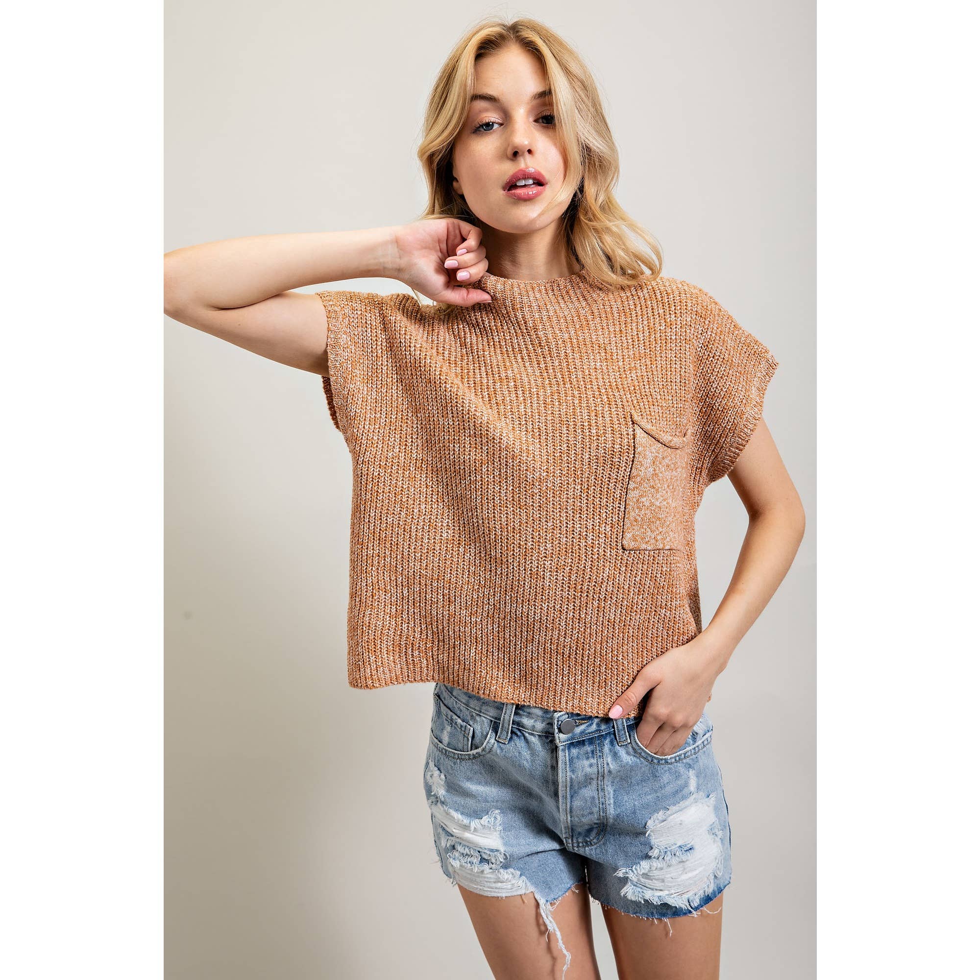 Sweater top made in rib-knit fabication - Funnel neckline - Front pouch pocket - Boxy fit - Model is 5' 10" 32-25-35 and wearing a Small