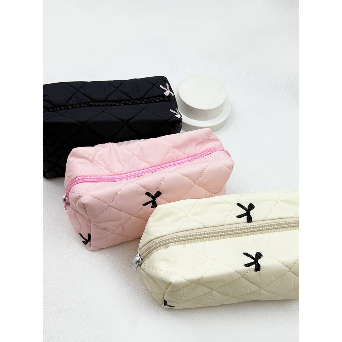 Soft Embossed Cloth with Bow Embroidery Light Weight Cosmetic Bag -Makeup Bags Portable Travel Cosmetic Bag and Organizer Multifunction Case. Portable and lightweight, easy to carry. You can bring your cosmetics to anywhere. -Individually Wrapped -Description: 7 Inch W Inch x 4.5 D x 4.5 H Inch -3 Colors 4pcs each total