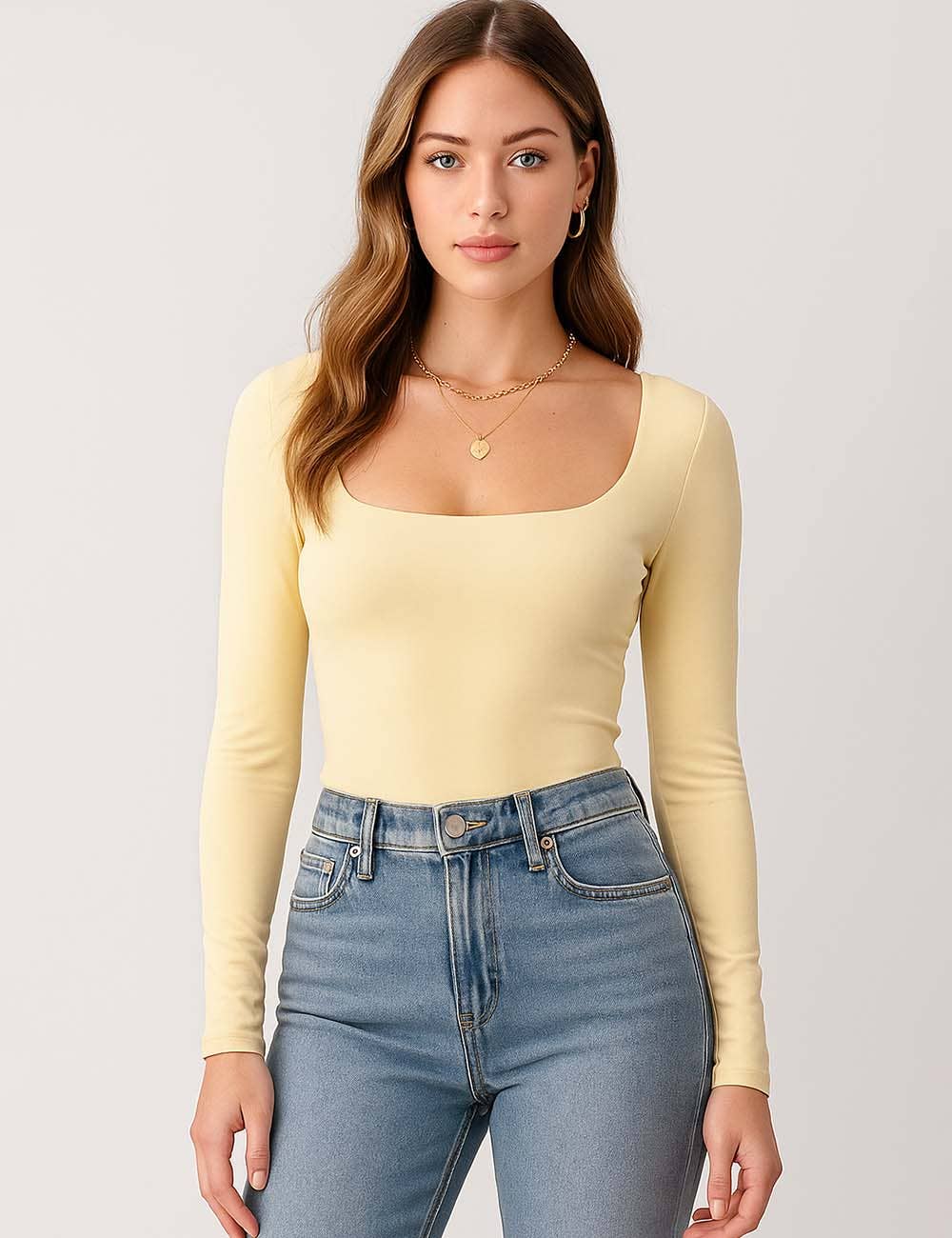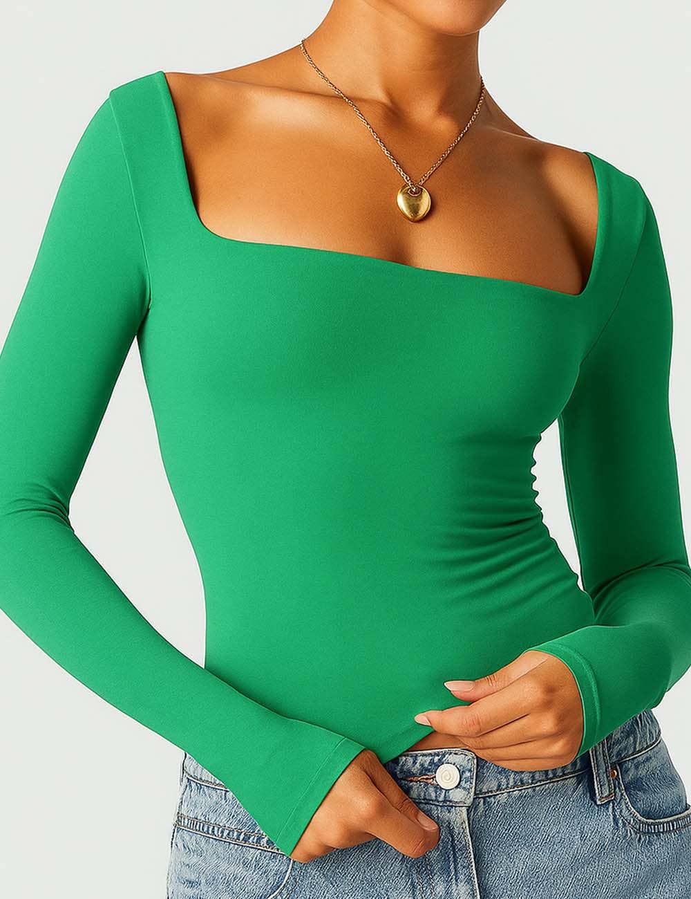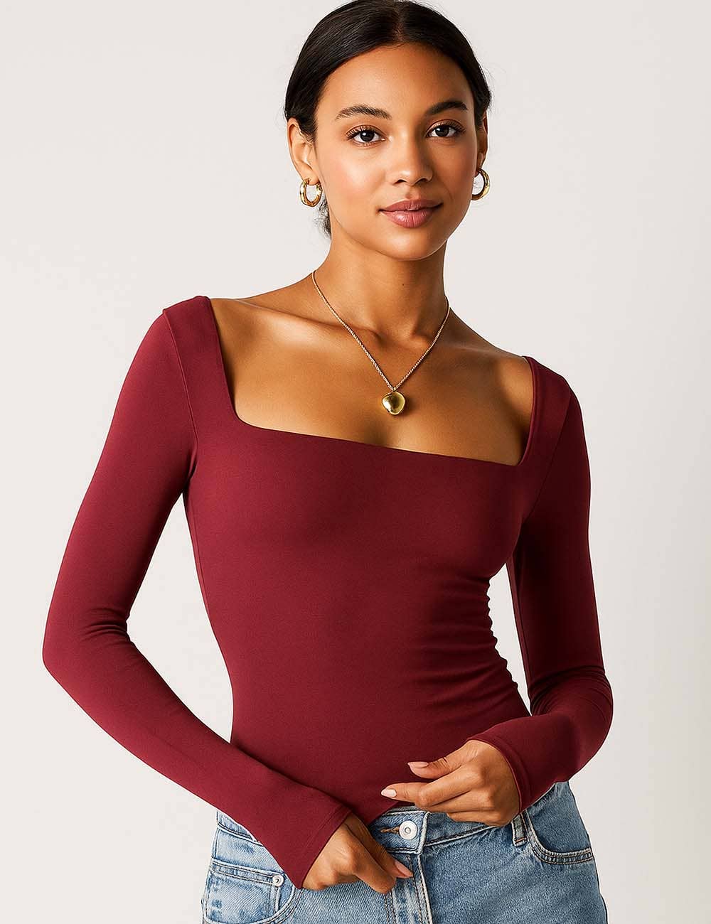 Features: * Ladies Basic Tee * Cotton and Polyester * Fabric with Stretch * Solid Color * Square Neck * Long Sleeves * Cropped Cut * Clean Line * Slim Fitting Package:* Package include 1 * Ladies Basic Tee Model Fitting: * Model wearing size S * Model Size: Height - 5'7" Bust - 33" Hips - 34.6" Waist- 24.4"