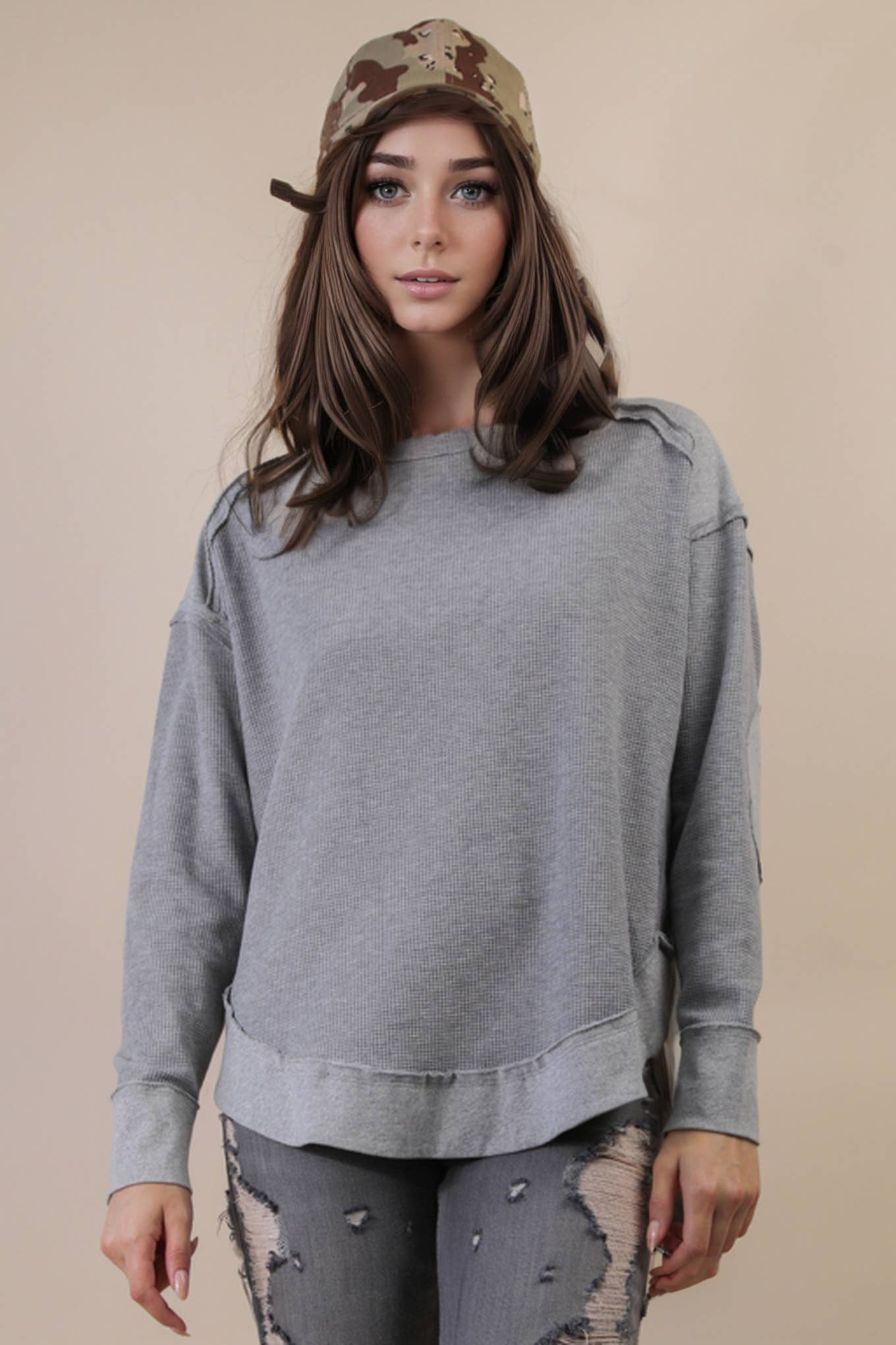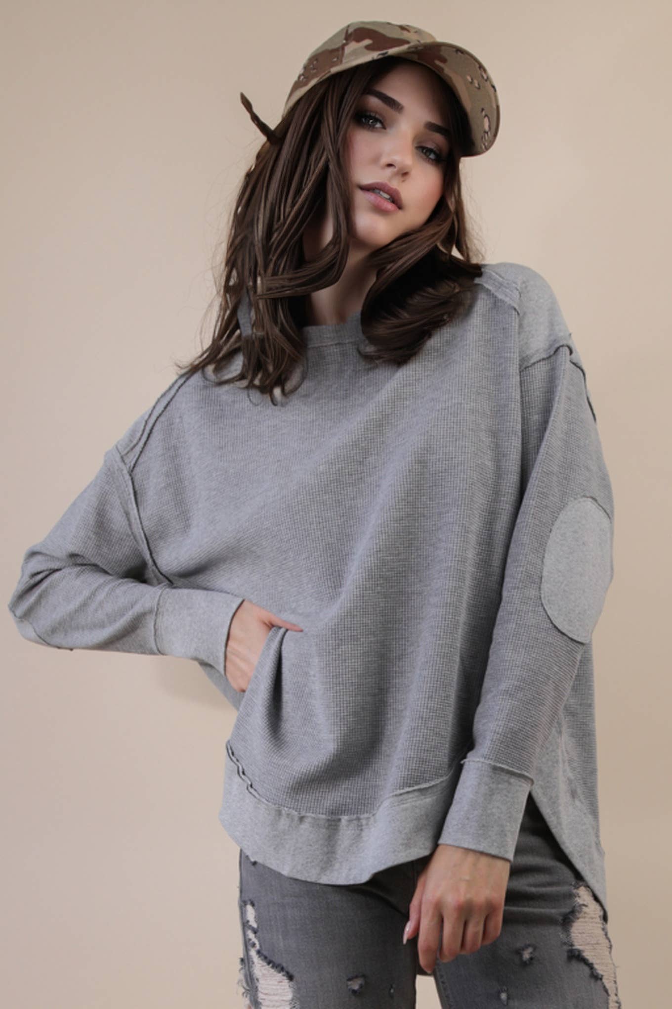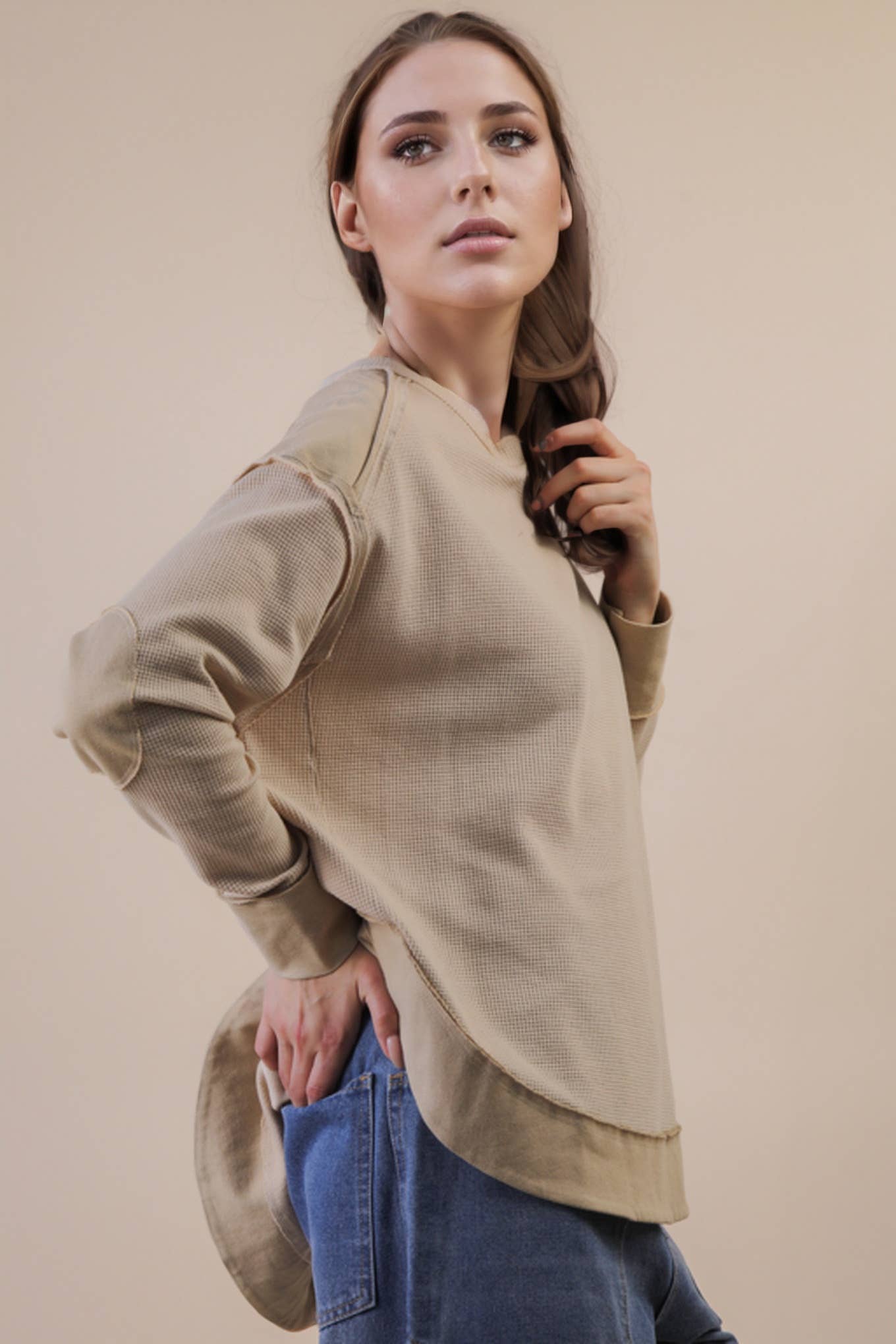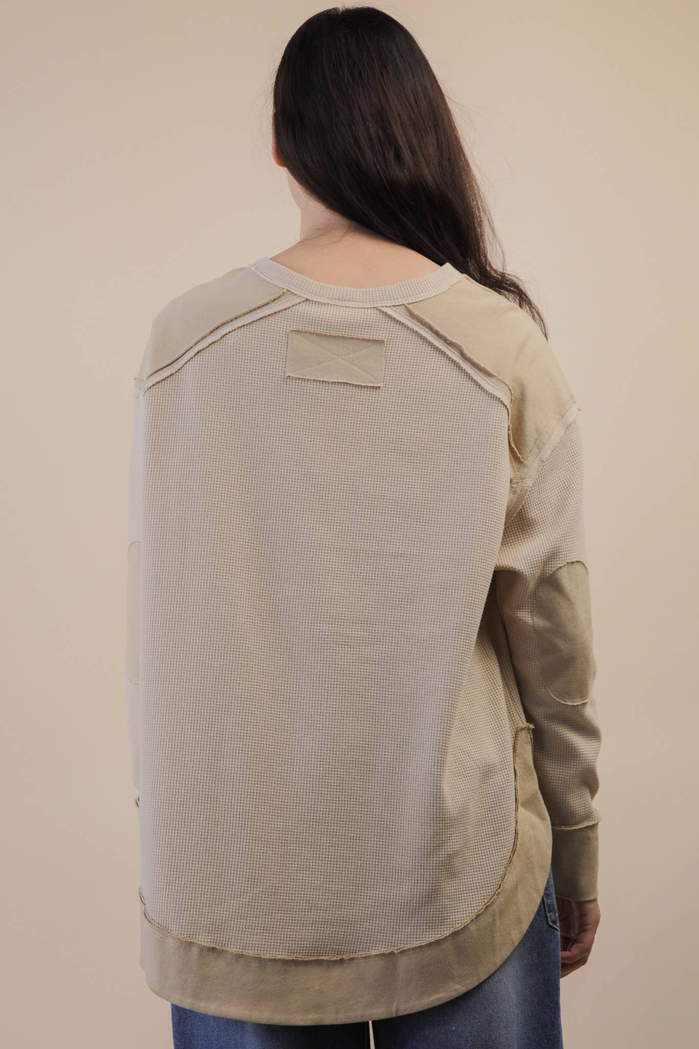 Mineral Washed Elbow Patch Contrast Knit Top - Oversized - Long Sleeve - Round Neck - Raw Edge Detail - Round Hem (Model height: 5"8", wearing a Small)