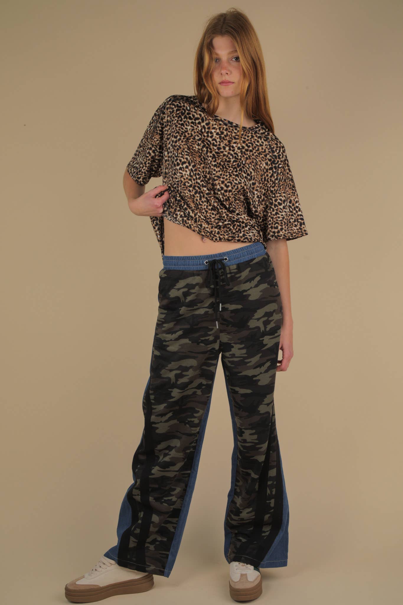 Oversized Leopard Printed Knit Top - Round Neck - Drop Shoulder - Short Sleeve - Round Hem - Raw Edge Detail (Model height: 5"10", wearing a Small) SELF:95 %POLYESTER 5 %SPANDEX