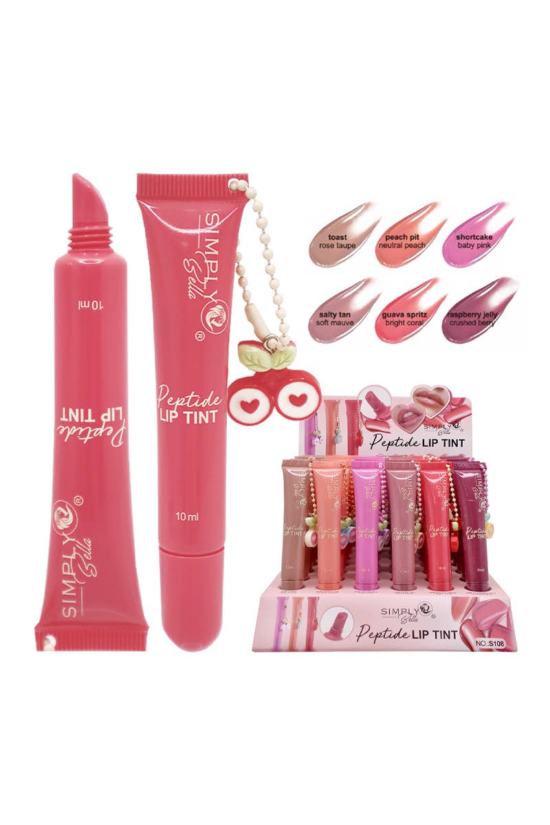 Simply Bella S108 Peptide Lip Tint With Charms. A vibrant, moisturizing lip product that combines rich color with nourishing care. Infused with peptides, this tint helps to keep lips smooth and hydrated while delivering long-lasting, buildable pigment. The creamy, non-sticky formula glides on effortlessly for a soft, glossy finish that enhances natural lip tone. Assorted in a range of six flattering shades including rose taupe, neutral peach, baby pink, soft mauve, bright coral, and crushed berry, there's a color for every mood and occasion. Its compact tube packaging with a slanted applicator makes it easy to apply on the go, and the adorable cherry charm adds a playful touch to any beauty routine. Perfect for daily wear. 36 pcs in display.