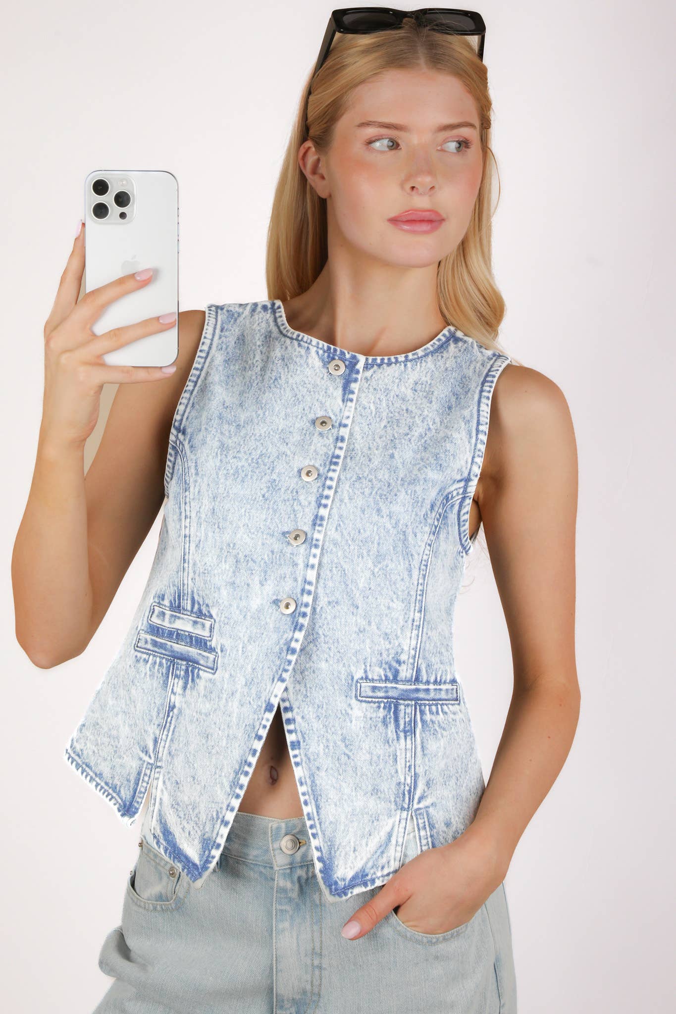 - VERY JEAN Acid Washed Denim Causal Vest - Button Down - Front Welt Pockets - Round Neck - Spilit Bottom (Model height: 5"7", wearing a Small)