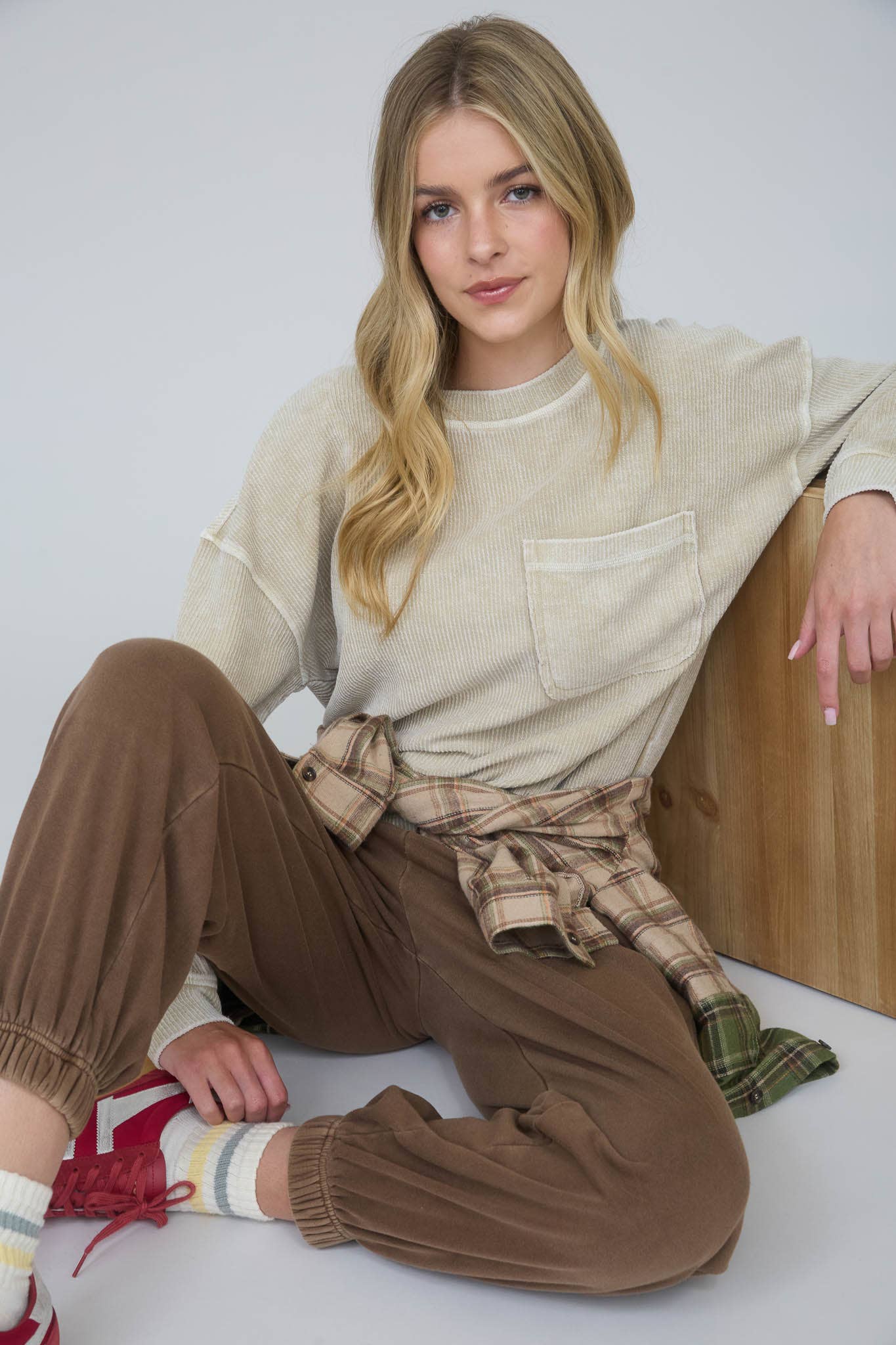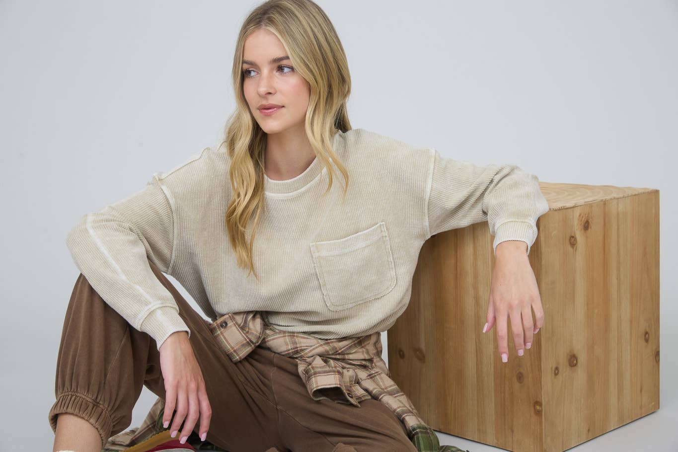 ROUND NECKLINE LONG SLEEVES DROP SHOULDER POCKET DETAIL RELAXED FIT RIBBED KNIT PATTERN ACID WASHED PATTERN TONES MAY VARY NOT LINED 60%COTTON 40%POLYESTER